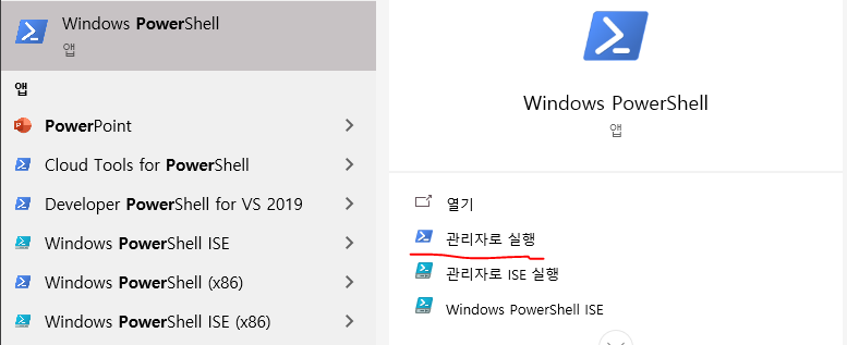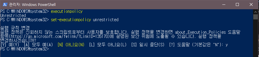 set-executionpolicy unrestricted 입력하고 y 입력하여 설정을 변경한다.