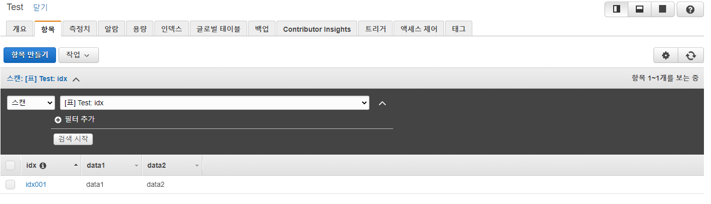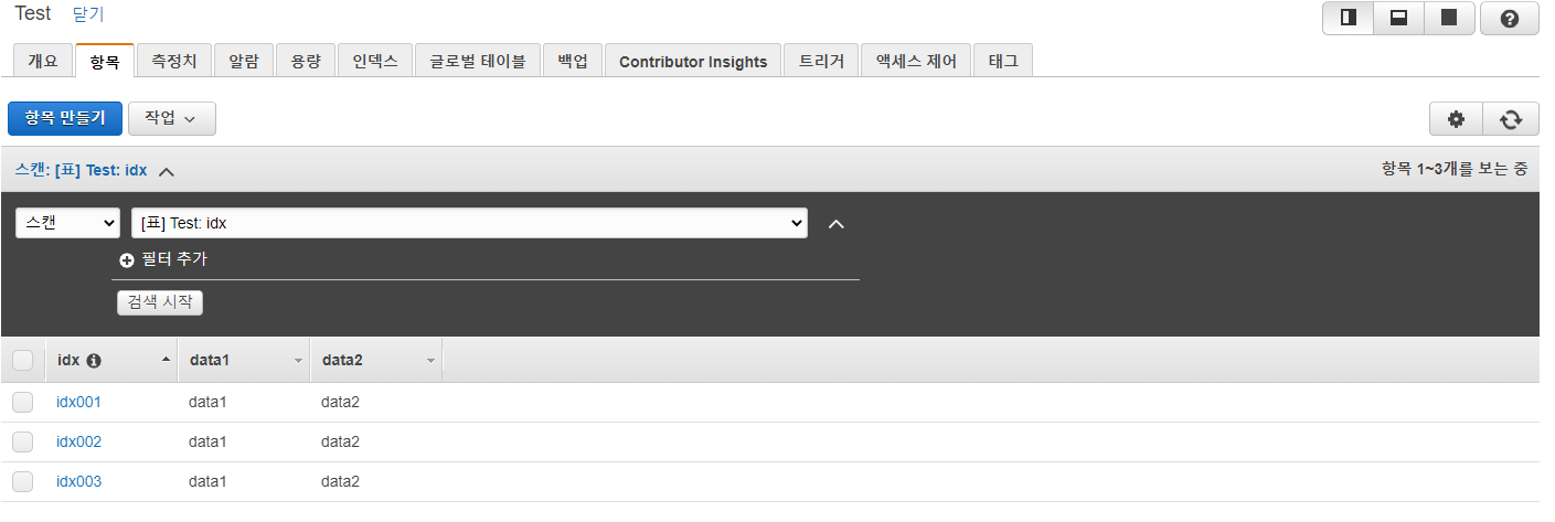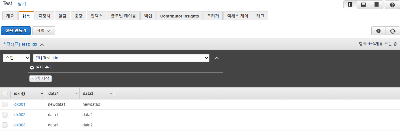 위의 코드를 실행하고, aws 의 dynamodb 테이블을 보자