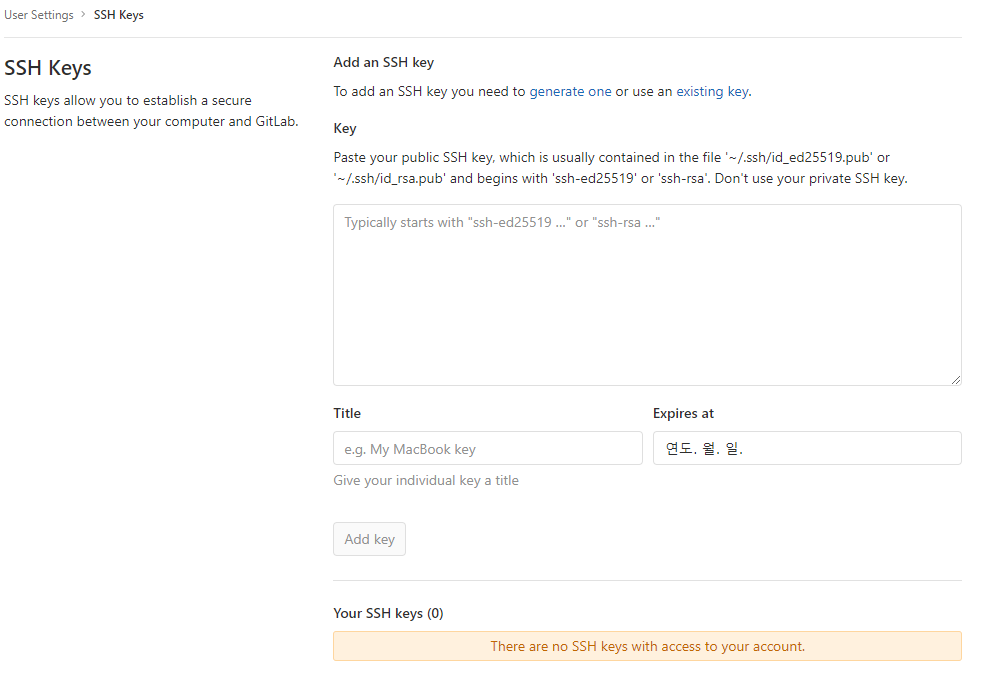 gitlab 에 들어가면 ssh key 를 등록하라고 뜬다. 등록해보자