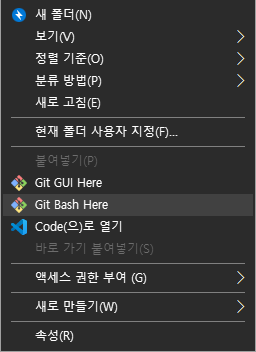 폴더 아무곳에서 마우스 오른쪽 버튼을 눌러 git bash를 연다.