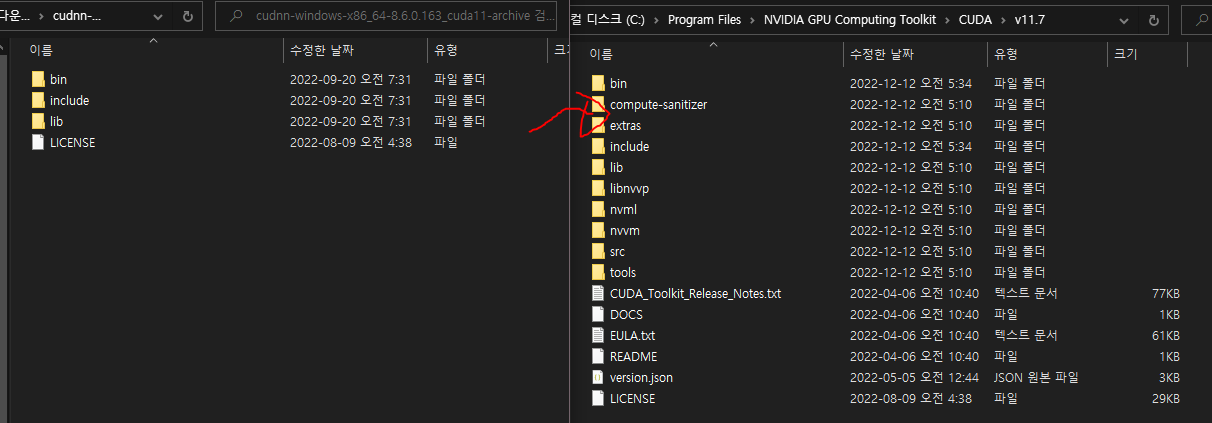 설치된 파일을 cuda 설치한 폴더로 옮긴다